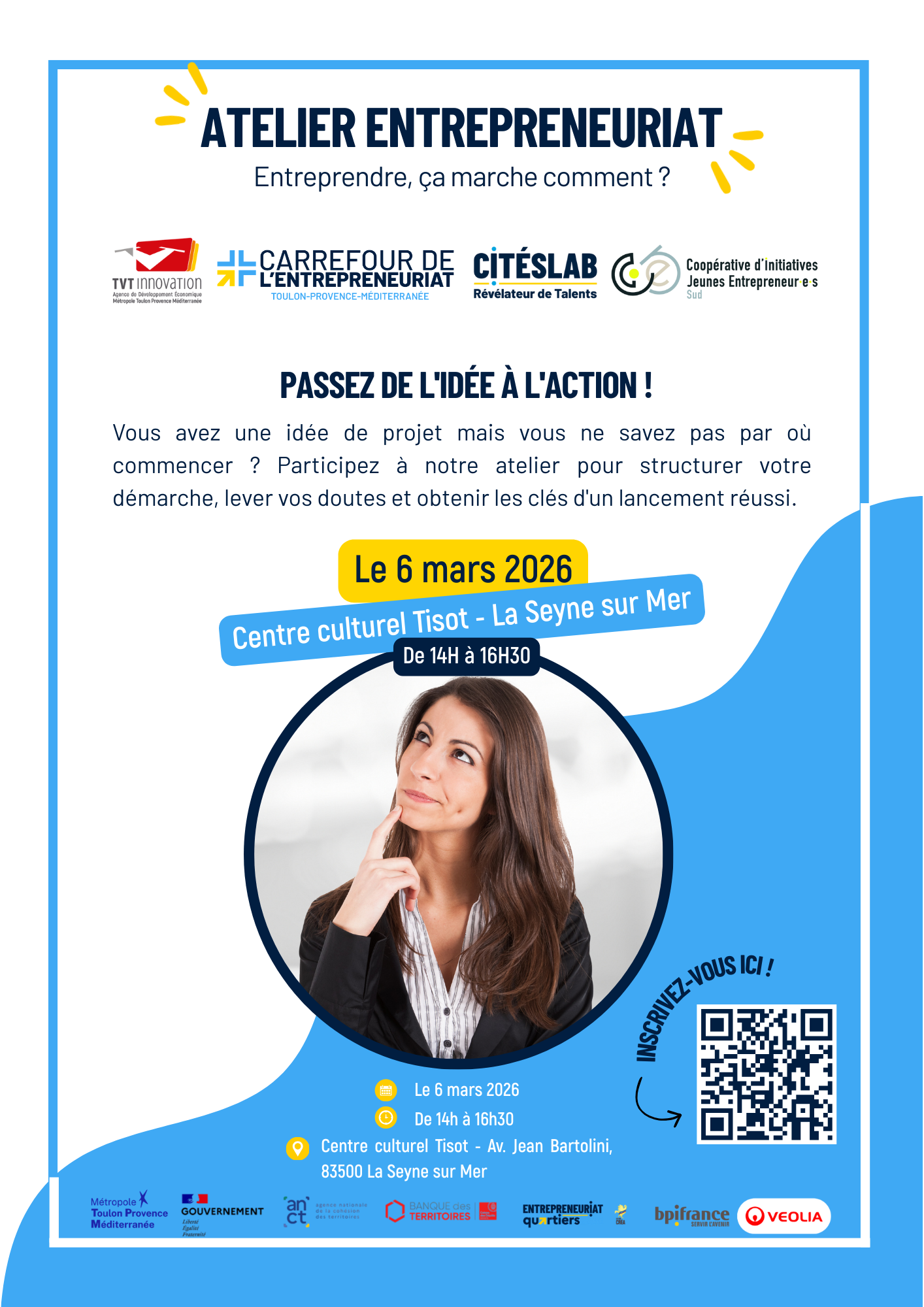 Le Carrefour de l’Entrepreneuriat TPM et le CitésLab de La Seyne sur Mer ont le plaisir de vous inviter à leur prochain atelier dédié à la création d'entreprise et à l'esprit entrepreneurial.