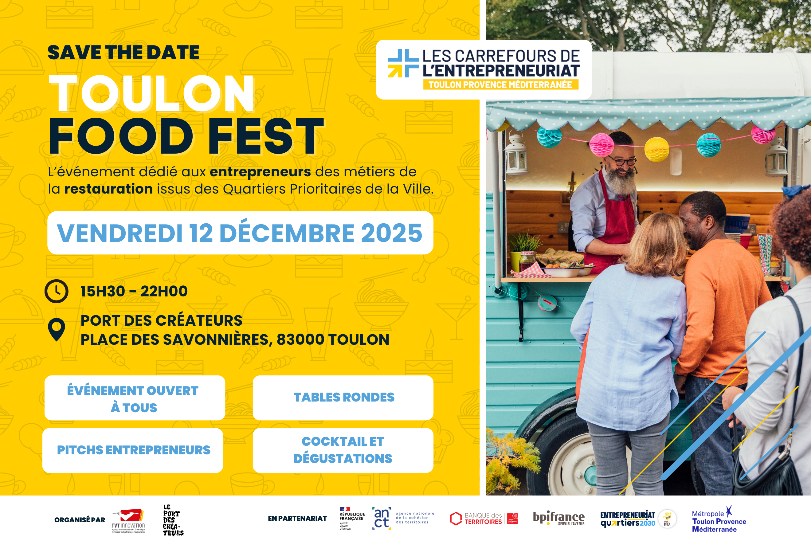 Nous sommes fiers de vous annoncer le lancement du Toulon Food Fest, le premier festival entièrement dédié à l'entrepreneuriat de la restauration dans les Quartiers Prioritaires de la Ville (QPV) !